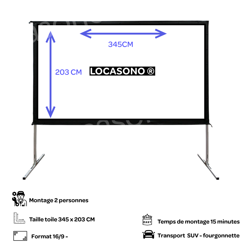La location de notre écran de 3.45 x 2.03 m avec valise offre une solution idéale pour vos besoins d'affichage mobile. Avec des dimensions généreuses, cet écran assure une visibilité optimale pour vos présentations, projections ou événements en extérieur. La valise fournie facilite le transport et assure la protection de l'écran, rendant son installation rapide et pratique. Optez pour la praticité et l'impact visuel avec notre écran et sa valise, une solution flexible et efficace pour vos besoins d'affichage.
