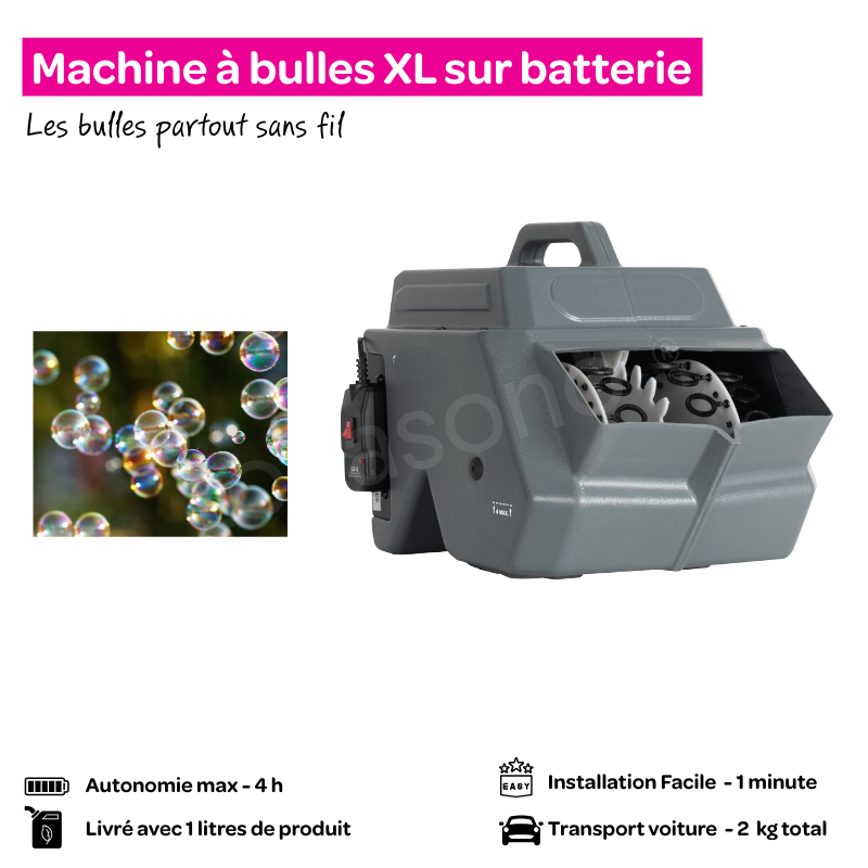 Offrez une ambiance féérique grâce à notre service de location de machine à bulles XL portable. Alimentée par batterie et facile à transporter, elle diffuse des centaines de bulles par minute avec ses 4 roues puissantes.