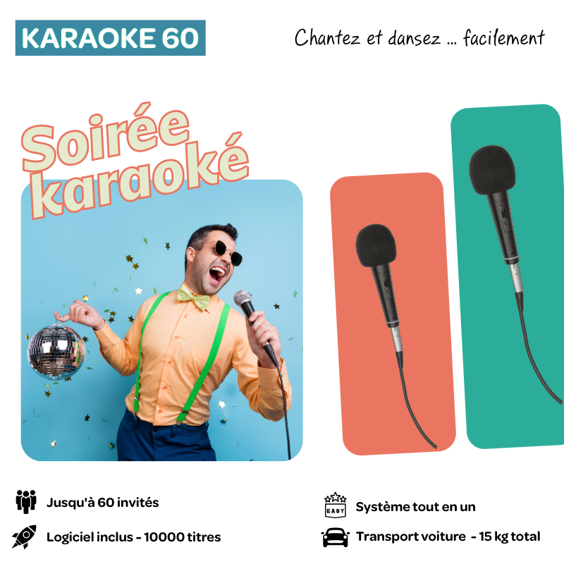 Faites de votre événement une expérience mémorable avec notre Pack Karaoké conçu pour divertir jusqu'à 60 personnes. Ce kit complet offre tout ce dont vous avez besoin pour animer votre prochaine soirée Karaoké