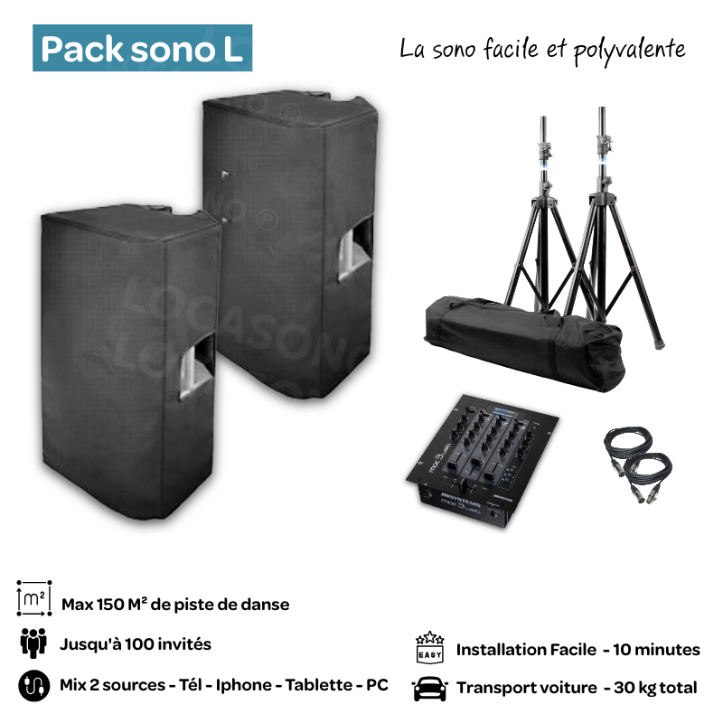 Le pack de sonorisation L sera adapté pour un public jusqu'à 100 personnes. Facile et rapide à installer en 10 minutes maximum. il est composé de 2 enceintes amplifiées de sonorisation, 1 table de mixage pour diffuser votre playlist, les pieds d'enceinte, et la connectique pour brancher 1 pc, ipad, ou 1 téléphone.