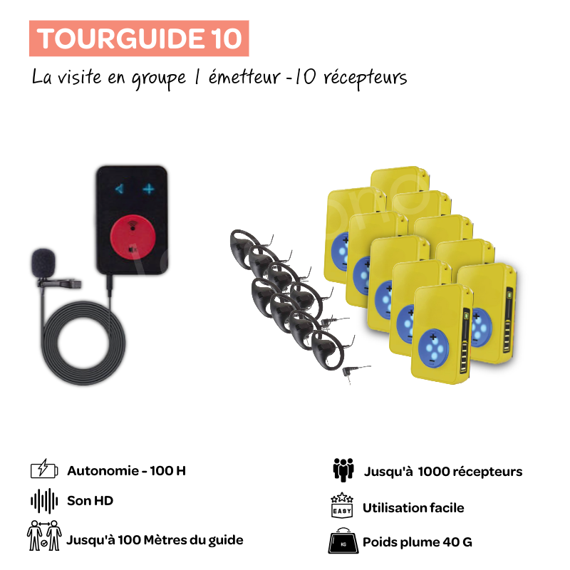 Le Pack Tour10 est une solution complète de location d’audioguide pour visites guidées, excursions et événements à Lyon et partout en France. Ce kit comprend :